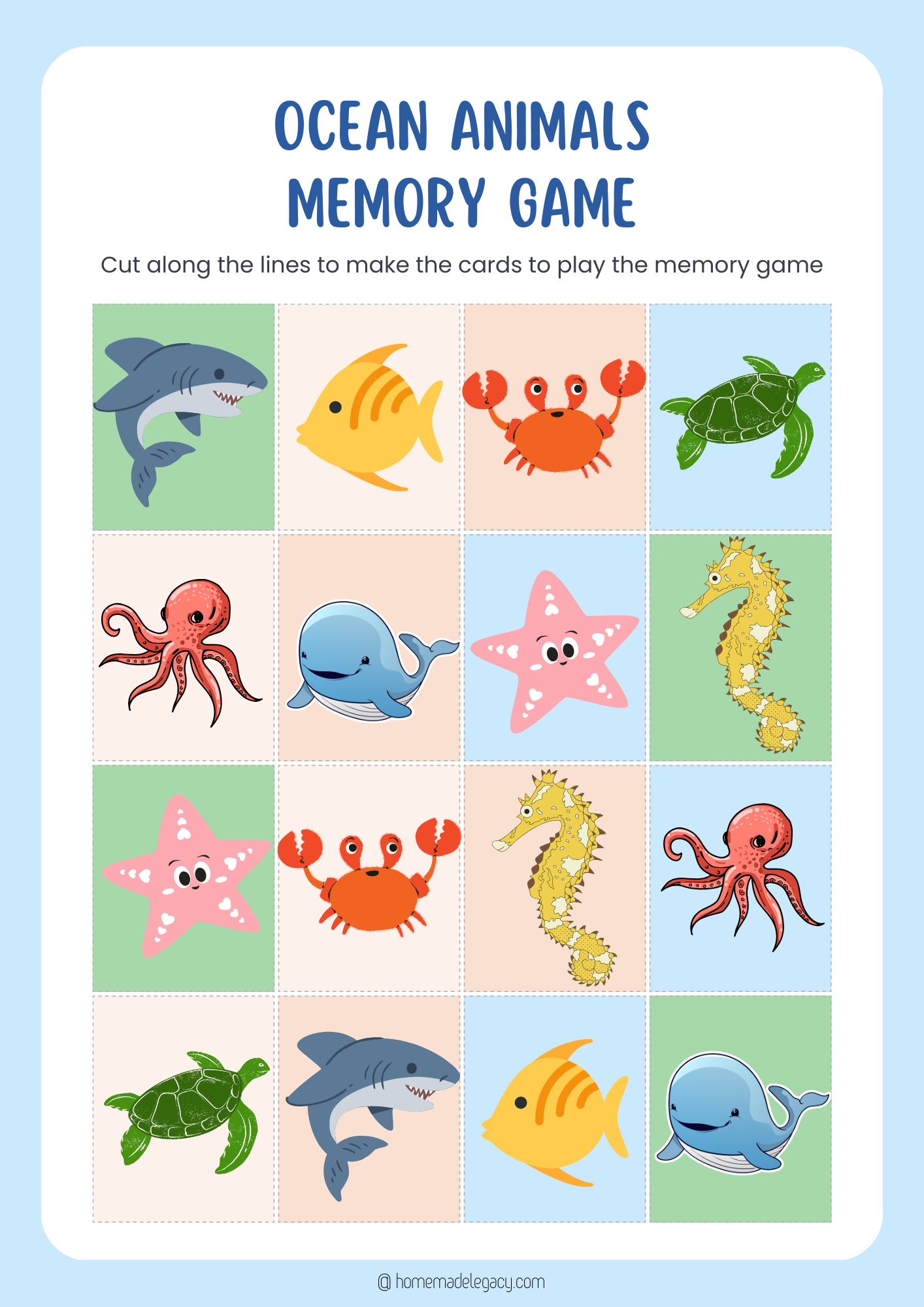 Download this sea animals printable and cut along the lines to make sea animal memory game cards.